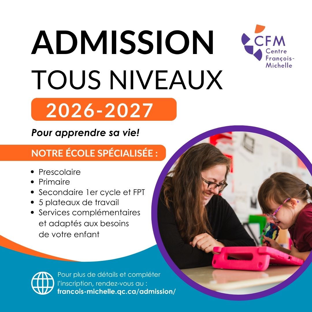 Le Centre François-Michelle accepte présentement les inscriptions pour la prochaine année scolaire 2026-2027. Notre école spécialisée accueille des jeunes ayant une déficience intellectuelle légère et des troubles associés, dans un milieu sécurisant et adapté à leurs besoins.