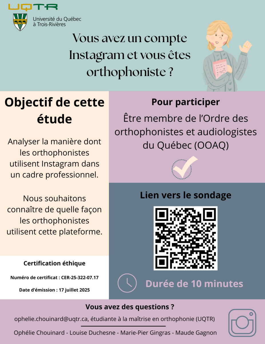 Nous invitons des orthophonistes du Québec à participer à un court questionnaire en ligne d'environ 10 minutes.