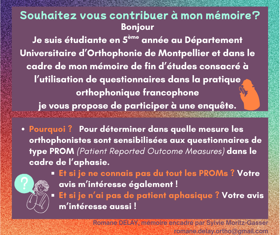 Mon travail vise à déterminer dans quelle mesure les orthophonistes sont sensibilisées aux questionnaires de type PROM (Patient Reported Outcome Measures) dans le cadre de l’aphasie.